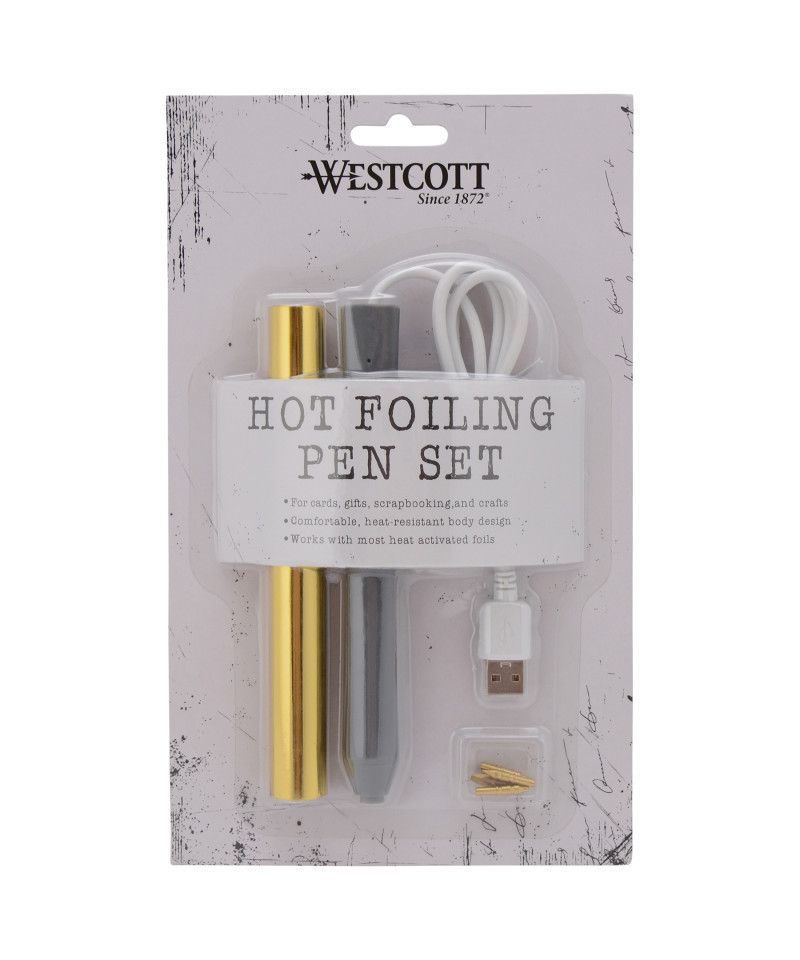 - Hot Foiling Pen Set containing: 1 Hot Foiling Pen, 1 Gold Heat Activated Foil Roll, Nib Switch Tool, 1 Fine Nib, 1 Standard Nib, 1 Bold Nib, 1 Calligraphy Nib, USB charging cord