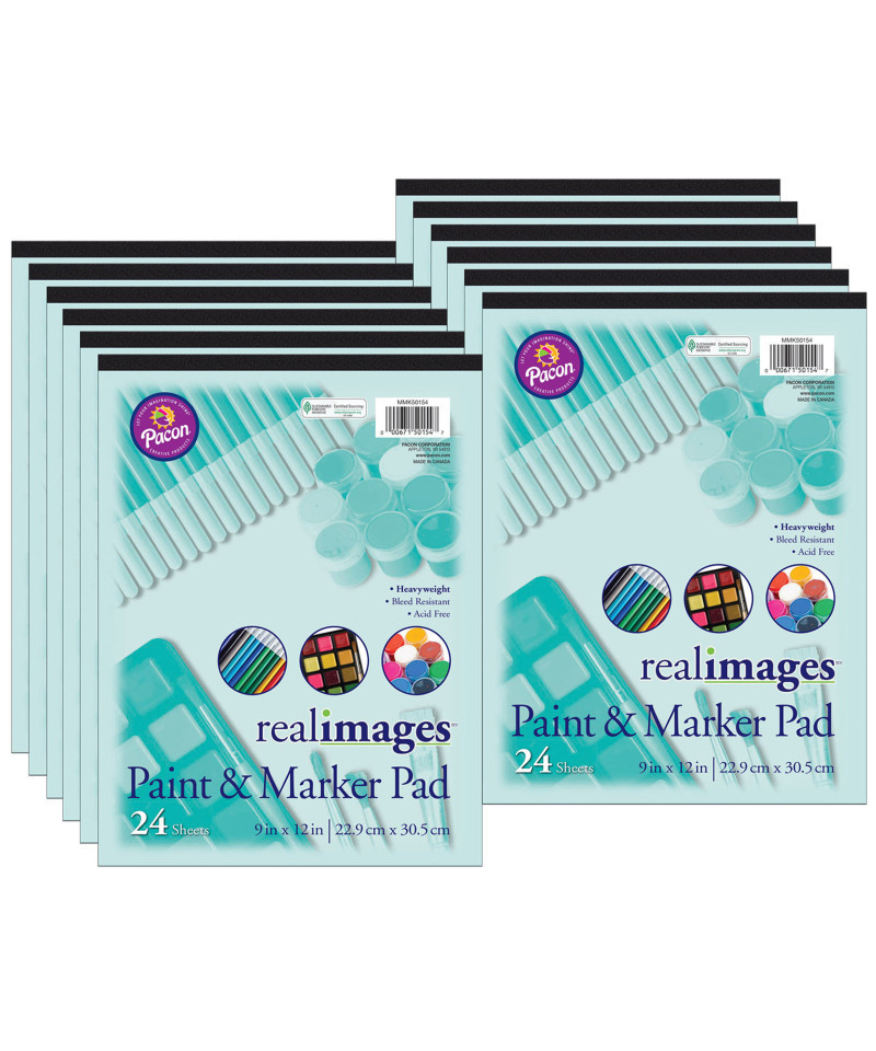 Real Images™ Paint & Marker pad provides a great value with heavyweight paper. Ideal for use with dry media as well as paint and marker. Tape-bound pad is ideal for elementary and student use. Acid-free and recyclable. Each pad includes 24 sheets and measures 9" x 12". Sold as a pack of 12 pads.
