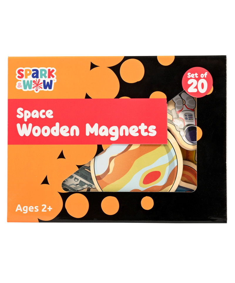 - 20 DIFFERENT SPACE SHAPES -- This wooden magnet set features 20 colorful magnets in different space-themed shapes. Decorate and play with rockets, planets, astronauts and more!