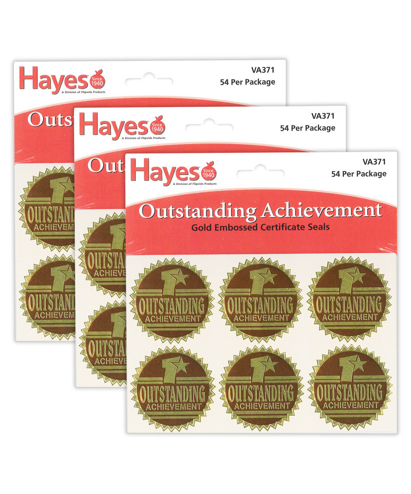 Outstanding Achievement Gold Foil Embossed Certificate Seals are gold foil embossed certificate seals add an extra touch of class to any certificate, award or diploma! Embossed with Outstanding Achievement and decorated with a #1 and a star for that special day. Also great for prizes and bulletin boards. Ideal for any Hayes award, certificate or diploma. Measures 1 3/4" diameter. Each pack includes 54 self-adhesive seals. Sold as 3 packs for a total of 162 seals.
