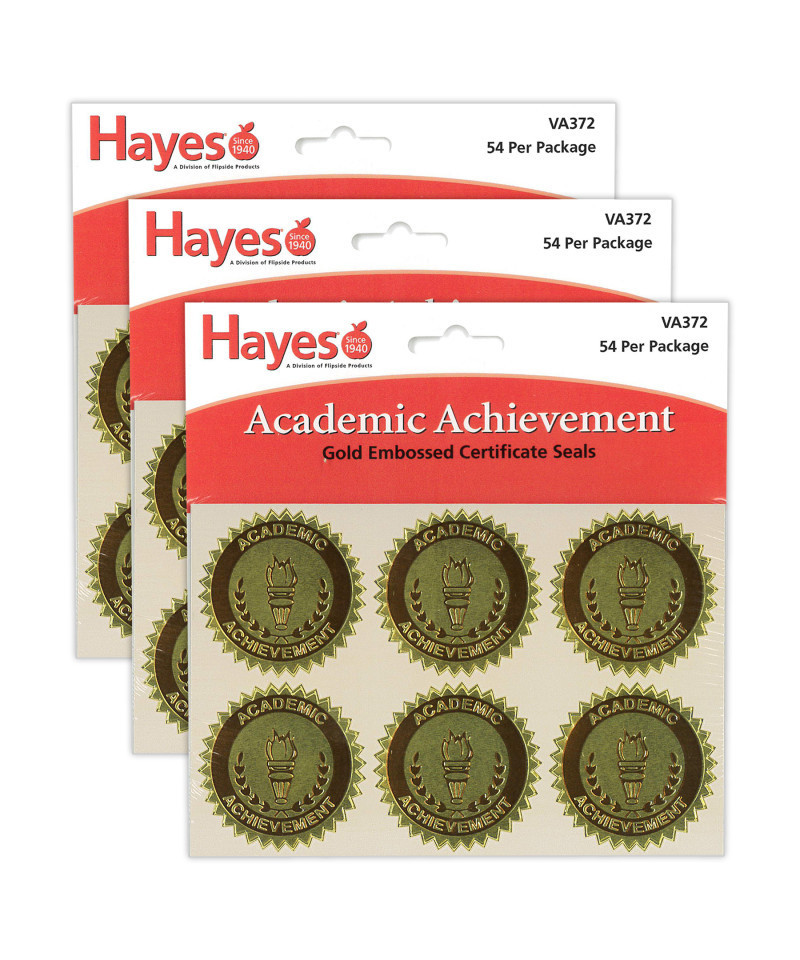 Academic Achievement Gold Foil Embossed Certificate Seals are gold foil embossed certificate seals add an extra touch of class to any certificate, award or diploma! Embossed with Academic Achievement and decorated with a flaming torch and laurels for that special day. Also great for prizes and bulletin boards. Ideal for any Hayes award, certificate or diploma. Measures 1 3/4" diameter. Each pack includes 54 self-adhesive seals. Sold as 3 packs for a total of 162 seals.