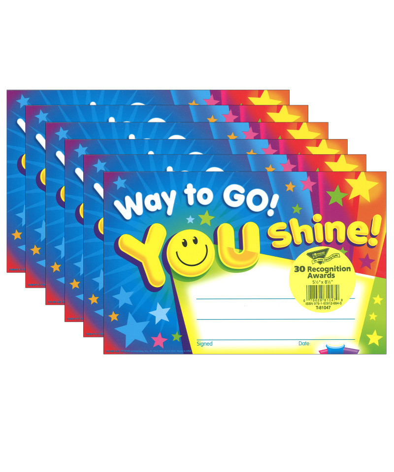 Reward progress and achievement with cheerful awards kids are proud to take home. Recognition Awards celebrate everyday accomplishments and big moments of success. Easy to customize to each occasion and child. 5 1/2" x 8 1/2". Each pack includes 30 awards. Sold as 6 packs for a total of 180 awards.