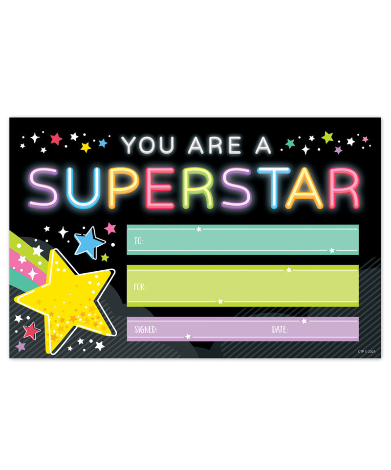 Let students know they are "Superstars!" with these vibrant "You Are a Superstar" Awards. The neon-inspired design is a fun way to recognize students' outstanding behavior, super effort, or positive attitude. This colorful student award can be used for children in a wide range of age or grade levels. Awards are easy to customize for each student and special occasion. Coordinates with Star Bright products. Measures 5-1/2" x 8-1/2". Each pack includes 30 colorful awards.