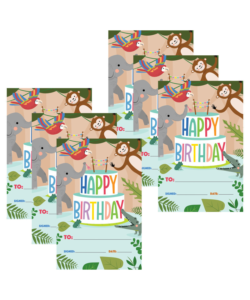 Celebrate birthdays with these colorful awards featuring our fun Jungle Friends. Awards are printed on sturdy paper stock so students can enjoy them for years to come. Coordinates with Jungle Friends products. Measures 5-1/2" x 8-1/2". Each pack includes 30 colorful awards. Sold as 6 packs for a total of 180 awards.