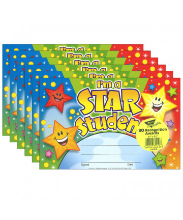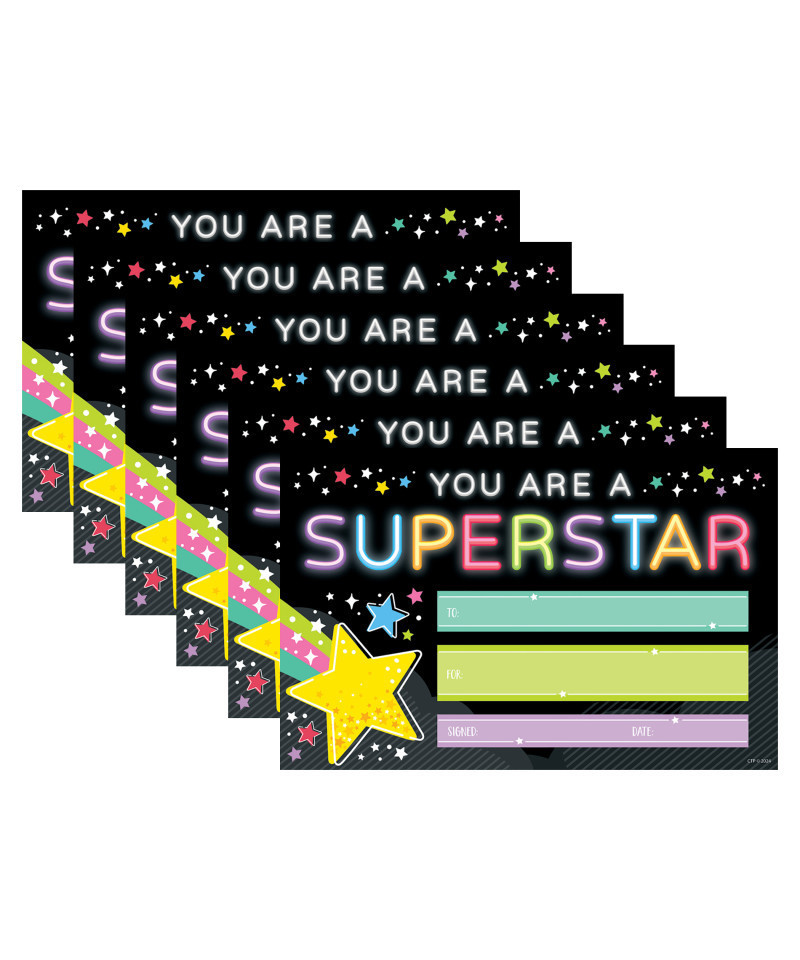 Let students know they are "Superstars!" with these vibrant "You Are a Superstar" Awards. The neon-inspired design is a fun way to recognize students' outstanding behavior, super effort, or positive attitude. This colorful student award can be used for children in a wide range of age or grade levels. Awards are easy to customize for each student and special occasion. Coordinates with Star Bright products. Measures 5-1/2" x 8-1/2". Each pack includes 30 colorful awards. Sold as 6 packs for a total of 180 awards.