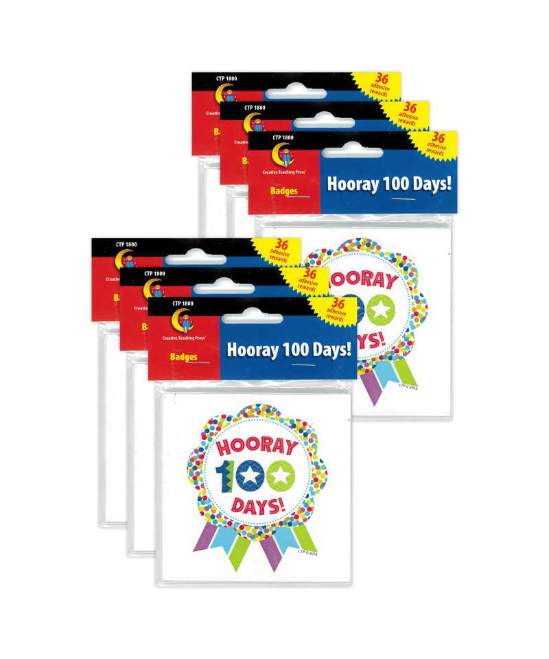 Celebrate completing 100 Days of School with these fun Hooray 100 Days sticker badges! Students will proudly wear these color badges all day long to celebrate this milestone. Parents will enjoy seeing students come home with their badge and be excited to hear about their 100th Day of School festivities. Acid-free. Badges measures approximately 3" x 2.5". Each pack includes 36 adhesive badges. Sold as 6 packs for a total of 216 badges.