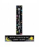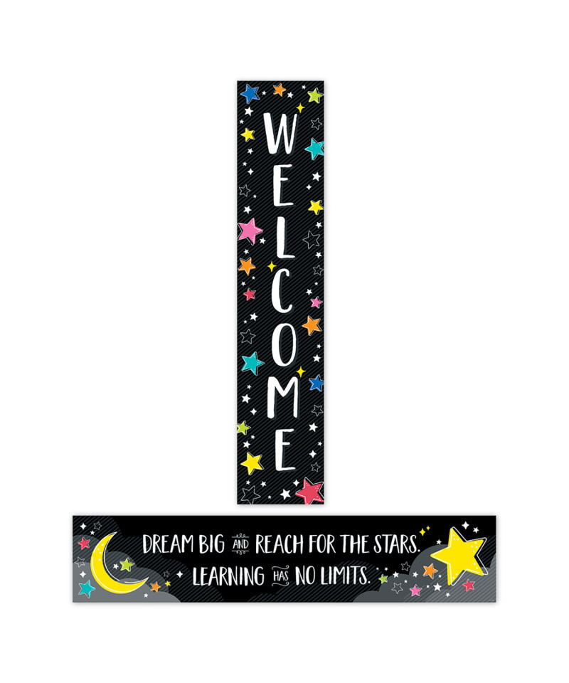This vibrant and versatile 2-sided banner features a different message on each side—Side 1: "Welcome" and Side 2: "Dream big and reach for the stars. Learning has no limits." It can be used during back-to-school to welcome students and parents then flipped over for inspiring messages the rest of the school year. The fully assembled banner measures over 3 feet wide! 2-sided, measures 8"w x 39"h. Coordinates with Star Bright products.