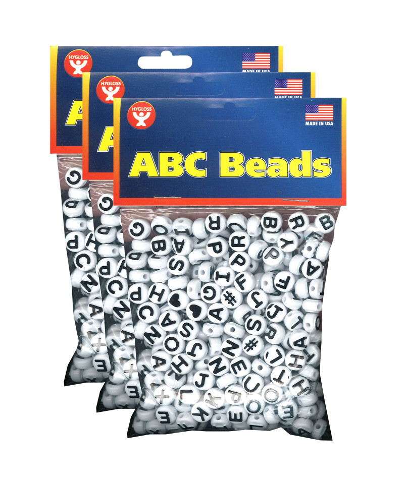 Black and White ABC Beads are perfect for creating original and beautiful bead crafts. Make personalized jewelry as a gift for someone special. These plastic ABC Beads are excellent quality and feature smooth, 2mm horizontal holes for easier beading. The beads are bright white, with a raised black alphabet letter on each side. Beads are 10mm in diameter and 6mm thick. Use this assortment of black and white ABC letter beads to create necklaces, bracelets, and other craft projects. Excellent for teaching the alphabet. Each pack includes 300 beads. Sold as 3 packs for a total of 900 beads.