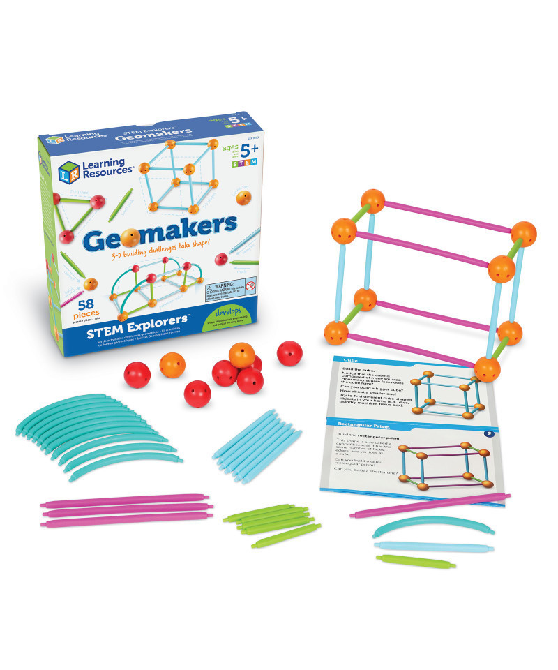 The world of early geometry skills takes shape! Kids craft their own 2-D and 3-D shapes during STEM-filled play sessions with Geomakers, one of the hands-on STEM Explorers activity sets. The set's included activity guide comes with 10 brain-teasing challenges, which help kids boost early geometry, critical thinking, and fine motor skills as they build shapes piece by piece. Challenges feature progressive difficulty and move from simple tasks like building shapes to more challenging tasks like designing and building bridges to help friends cross from one side to the other. In addition to STEM challenges, Geomakers also supports independent, open-ended play; this 59-piece set comes with enough sticks, curves, and connector pieces to help kids build triangles, rhombuses, trapezoids, or whatever wacky shapes they might dream up. STEM Explorers: Geomakers adds hands-on fun to math lessons, and helps kids build shape recognition skills every time they play.