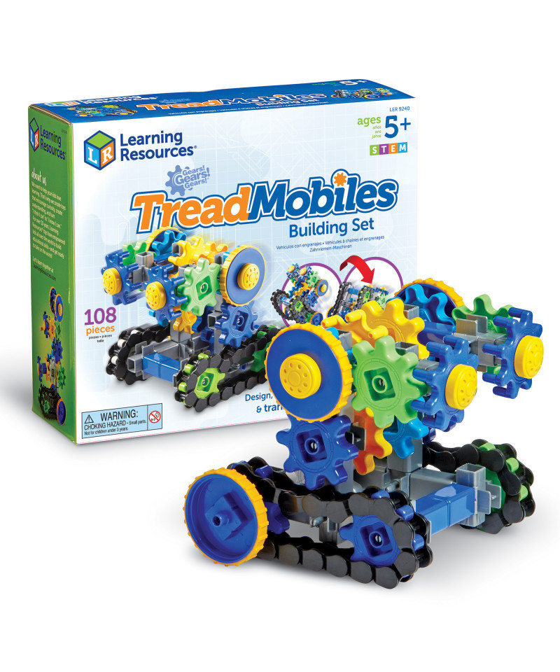 Gears, meet treads! Kids can design and build the STEM creations of their dreams with Gears! Gears! Gears! Treadmobiles from Learning Resources. This 108-piece STEM building set inspired by our best-selling Gears! Gears! Gears! series, this build-it-yourself toy includes all-new special tread components for designing and building robots, cars, and machines that move like tanks and conveyor belts. Kids can follow along with the included STEM Activity Guide, or use their imaginations to devise open-ended builds of their own—with 108 pieces, they have everything they need to make their creations come to life! Every time they build a new Treadmobile, kids also boost their early engineering, critical thinking, and other essential STEM skills. All pieces included in Gears! Gears! Gears! Treadmobiles work with all other Gears! building sets, so the possibilities are as fun as they are limitless! This set is also perfect for school STEM club and other group play!