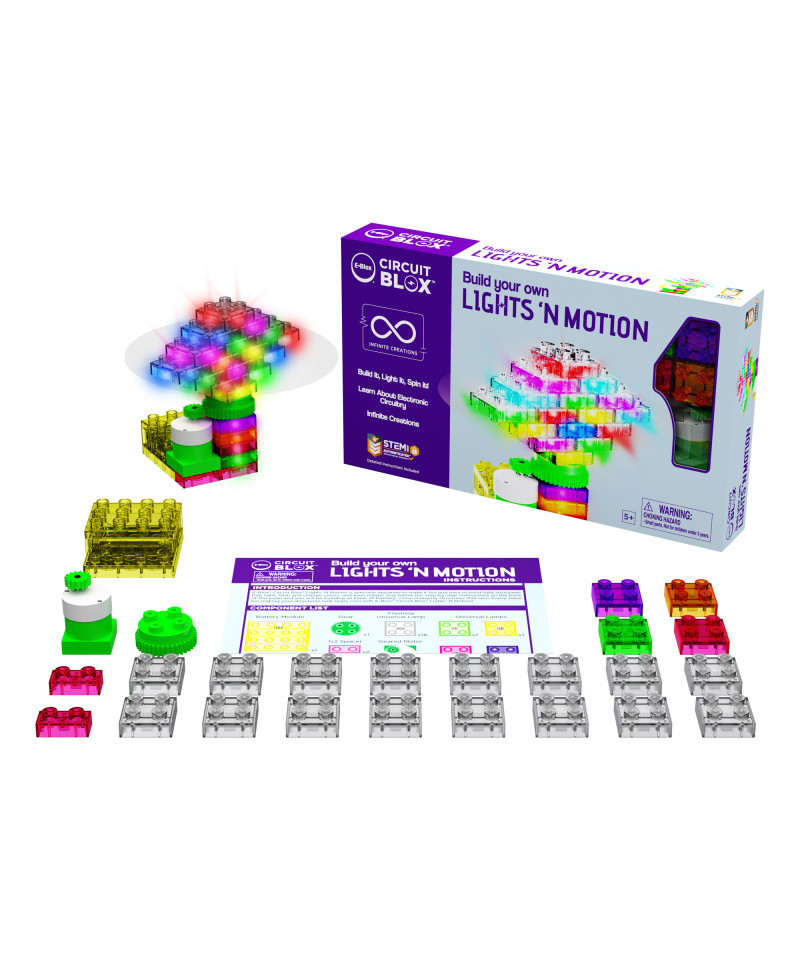 This set is ideal for in-class, home schooling or teaching through e-learning of STEM. The colorful building blocks contain electronic components such as a battery module, a geared motor module, a gear module and LED modules. Includes online animated curriculum only available with E-Blox Student Sets. Lessons cover Building Fundamentals, Electricity & Circuits, Motors, Gears & Light.