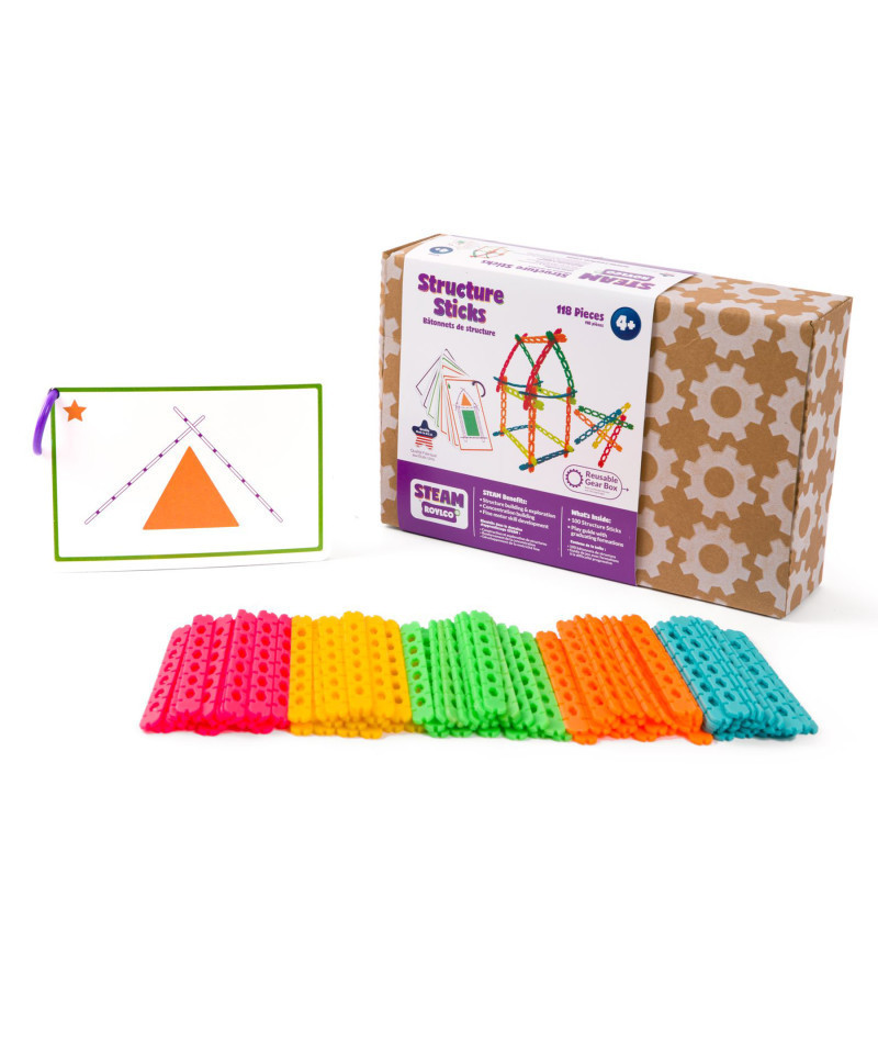 This open-ended building toy inspires creativity while enhancing early engineering skills and problem-solving. Use the included play guide as a runway for all of your complex creations! Has STEAM development. Includes 100 structure sticks and play guide with graduating formations.
