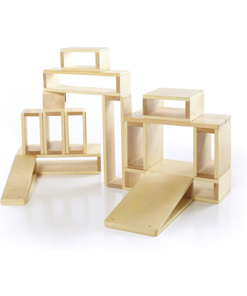 Oversized hollow blocks for giant creations! This 16-piece set is constructed of birch plywood and solids. Edges are rounded and surfaces are sanded smooth for safety and hours of creative play. Blocks are sealed and finished inside and out. For indoor use only. Largest block measures: 15.5"W x 8"D x 4"H. Smallest block measures: 4"W x 8"D x 4"H. Ages 3+.