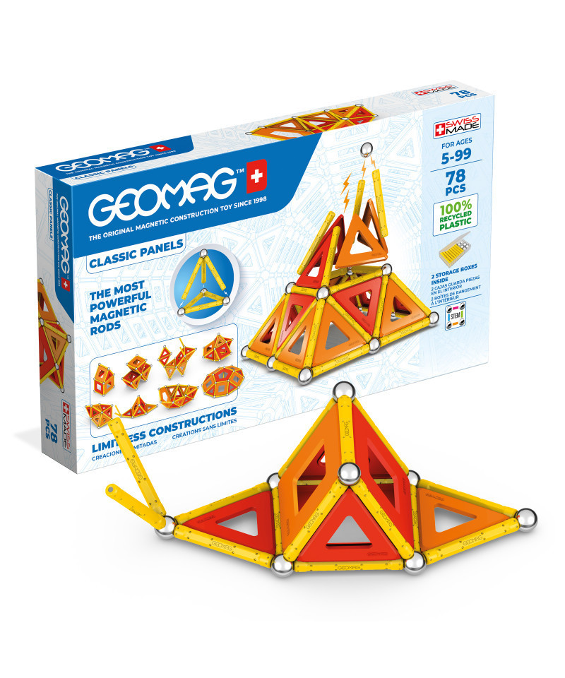 Discover the original Geomag experience with Classic Panels Recycled 78. Magnetic rods, steel spheres and geometric panels connect into endless 2D patterns and 3D structures, helping kids understand shapes, symmetry and engineering basics as they build.