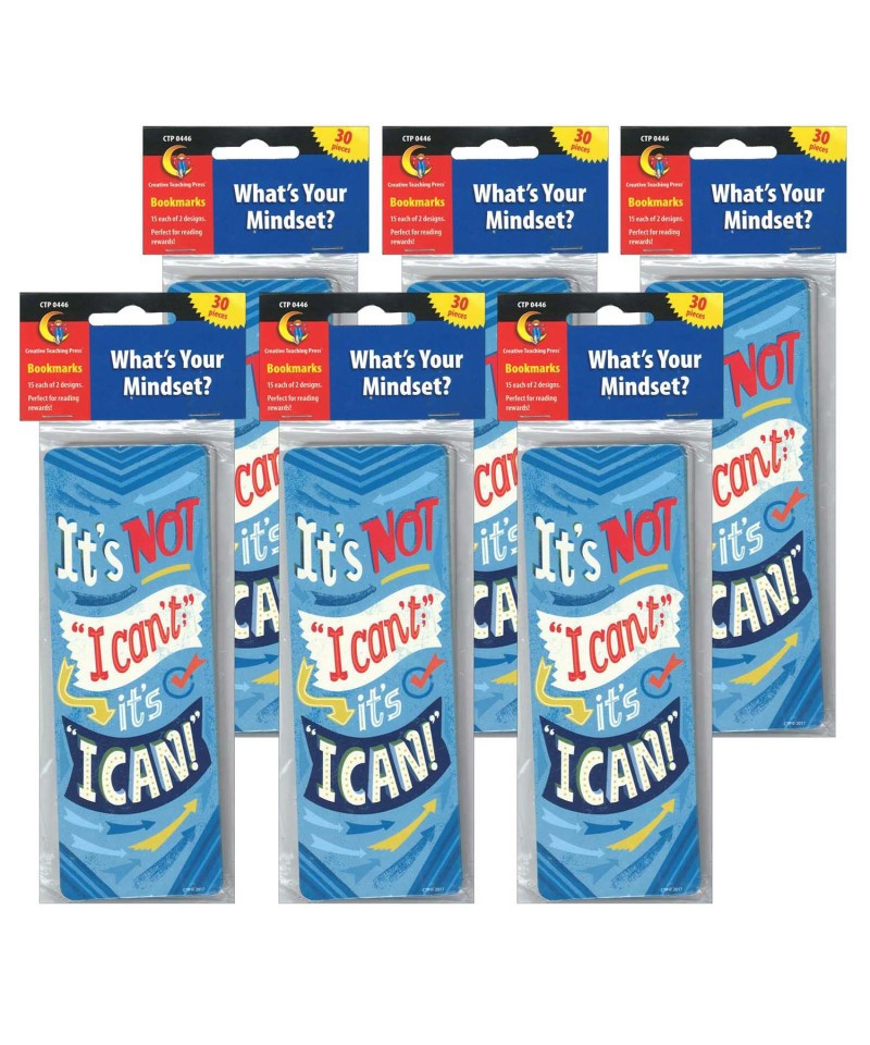 Bookmark 1: It's not, "I can't;" it's "I can!" Bookmark 2: My brain is like a muscle. When I exercise it, it gets stronger. Bookmarks measures approximately 2.5" x 7". Each pack includes 30 bookmarks, 15 each of 2 designs. Sold as 6 packs for a total of 180 bookmarks.
