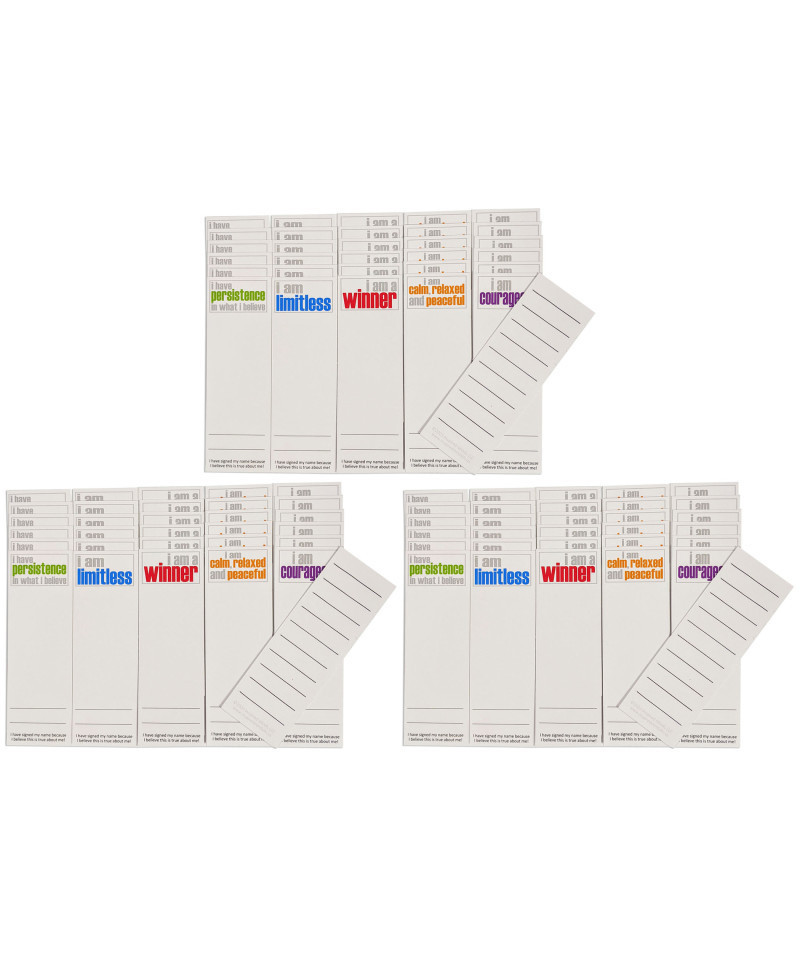 Each Inspired Minds Hopefulness Booster Set consists of 30 Page Keepers. There are 5 statements intentionally printed simple, yet colorful, to offer an impactful and creative way to help gain hopefulness and build character to last a lifetime. These page keepers not only work as a daily reminder, but can be signed to take ownership of believing in yourself! Because these are uncoated, with the blank space in the front and lines on the reverse side, there are unlimited uses. Draw, color, add pictures, list books, friends, story content or favorite characters, record reading time, and the list goes on! Laminate as a keepsake! Page keepers measure 2" x 6". Each set has 6 each of the 5 titles that match all Hopefulness Booster Sets. Sold as 3 sets for a total of 90 page keepers.