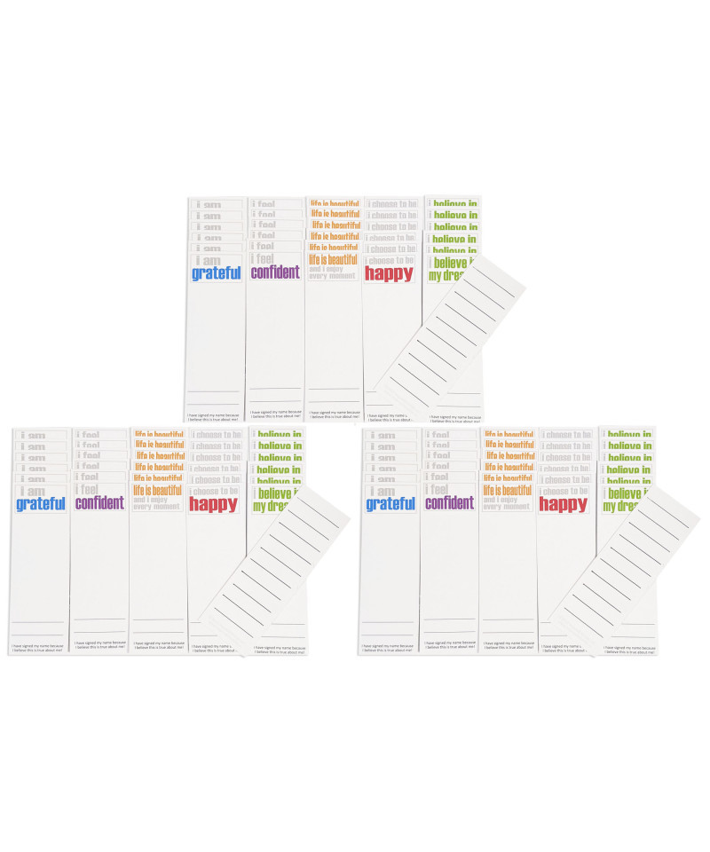 Each Inspired Minds Confidence Booster Set consists of 30 Page Keepers. There are 5 statements intentionally printed simple, yet colorful, to offer an impactful and creative way to help gain confidence and build character to last a lifetime. These page keepers not only work as a daily reminder, but can be signed to take ownership of believing in yourself! Because these are uncoated, with the blank space in the front and lines on the reverse side, there are unlimited uses. Draw, color, add pictures, list books, friends, story content or favorite characters, record reading time, and the list goes on! Laminate as a keepsake! Page keepers measure 2" x 6". Each set has 6 each of the 5 titles that match all Confidence Booster Sets. Sold as 3 sets for a total of 90 page keepers.