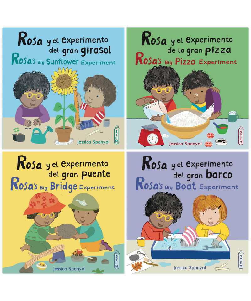 Rosa and her friends return for more fun, conducting basic experiments involving science, technology, engineering and number skills. The books provide examples of critical thinking and tool use. These four books celebrate diversity and challenge gender stereotypes, showing that all children can have a passion for STEM. Rich in specialized language and observational exercises, these books encourage budding scientists to record their findings. Four titles include: Rosa y el experimento del gran puente/Rosa's Big Bridge Experiment, Rosa y el experimento del gran barco/ Rosa's Big Boat Experiment, Rosa y el experimento del gran girasol/ Rosa's Big Sunflower Experiment, and Rosa y el experimento de la gran pizza/Rosa's Big Pizza Experiment. Each book has 20 pages.
