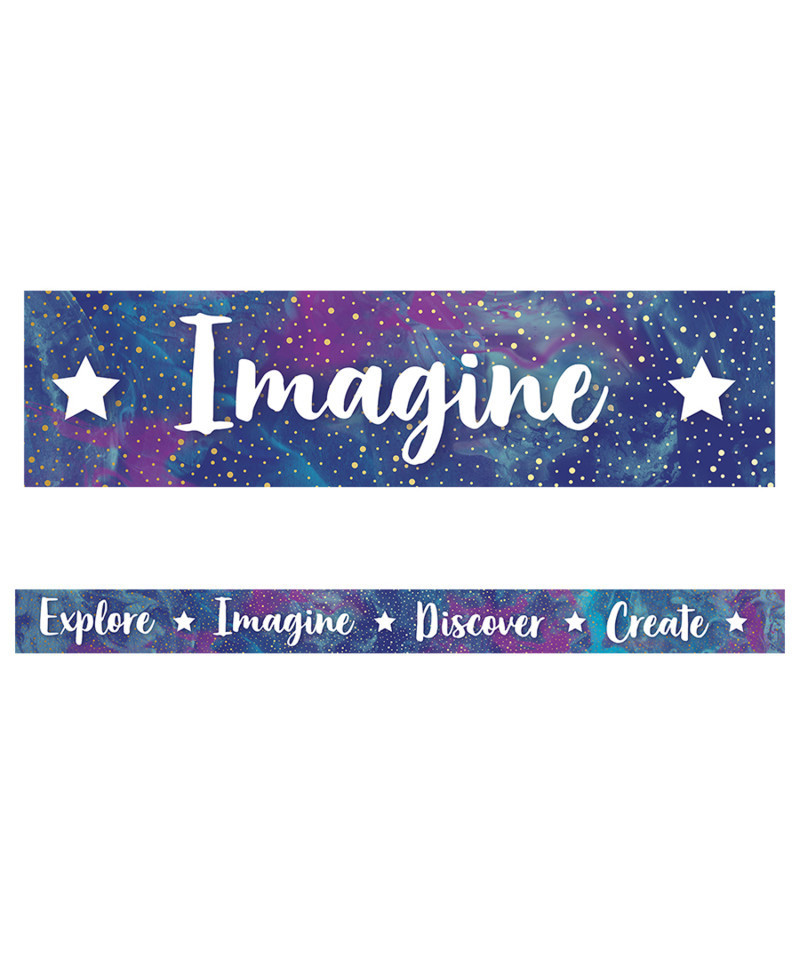 Give your bulletin board displays the perfect finishing touch with straight borders. Galaxy Straight Borders feature a marbled blue and purple background with the motivational phrases Explore, Imagine, Discover, and Create. This border pack includes 12 strips—each measuring 3' x 3" for a total length of 36'.