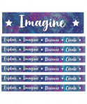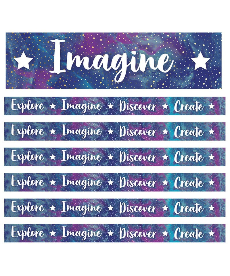 Give your bulletin board displays the perfect finishing touch with straight borders. Galaxy Straight Borders feature a marbled blue and purple background with the motivational phrases Explore, Imagine, Discover, and Create. This border pack includes 12 strips—each measuring 3' x 3" for a total length of 36'. Sold as 6 packs for a total of 72 strips and 216' of border.