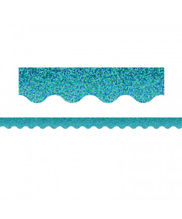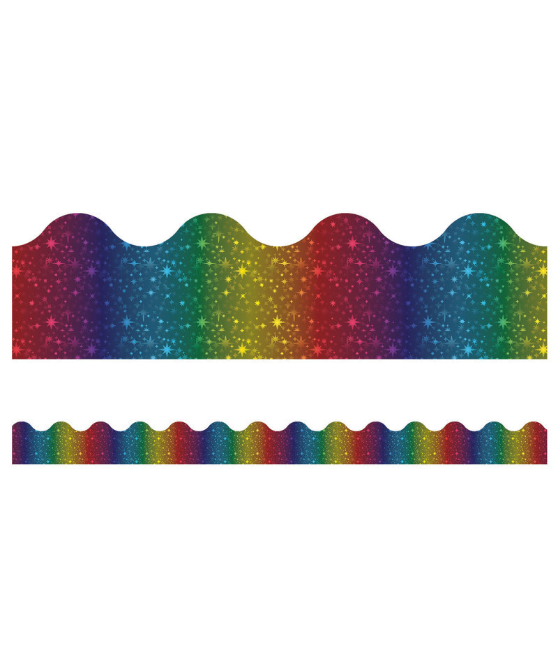 Give your bulletin board displays the perfect finishing touch with eye-catching border trim. The pack of Sparkle + Shine Rainbow Foil Scalloped Borders includes 13 border strips, each measuring 3' x 2.25" for a total length of 39'.