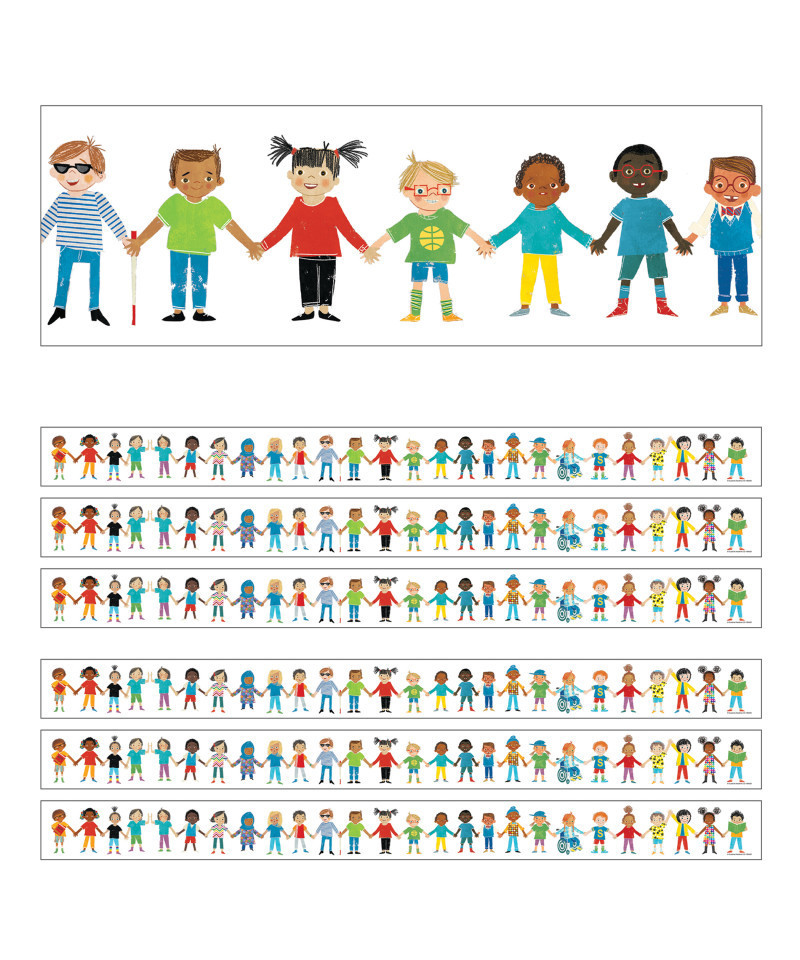 Give your bulletin board displays the perfect finishing touch with eye-catching border trim. These eye-catching borders feature a colorful, friendly line of beautiful children from different cultures. Each All Are Welcome Kids Straight Borders pack includes 12 border strips, each measuring 3' x 3" for a total length of 36 feet per pack. Sold as 6 packs for a total of 72 strips (216 feet).