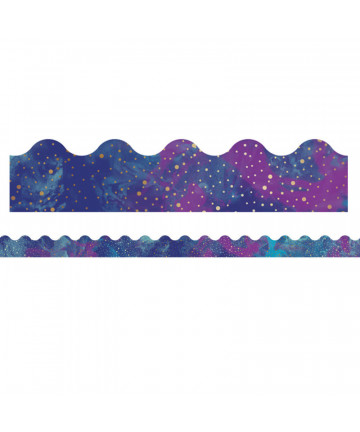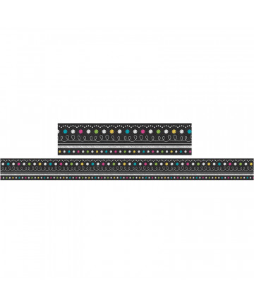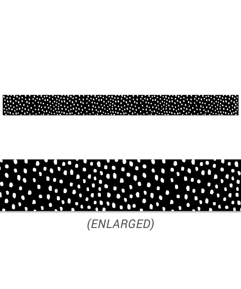 The newest trend in polka dots are messy dots! This Core Decor Messy Dots on Black Border features casual white polka dots on a black background. This is a bold and versatile way to trim any bulletin board or classroom display in any type of school setting at any grade level! Also great for use in an office, a church, a college dorm, or a senior living residence. With its simple design, this bulletin board border can be used alone to create a basic look or layered with another border for a more designer look. These new EZ borders come in smaller strips, which are easier to manage and store. Measures 3" wide x 24" long. Each pack includes 24 strips for a total of 48 feet of border.