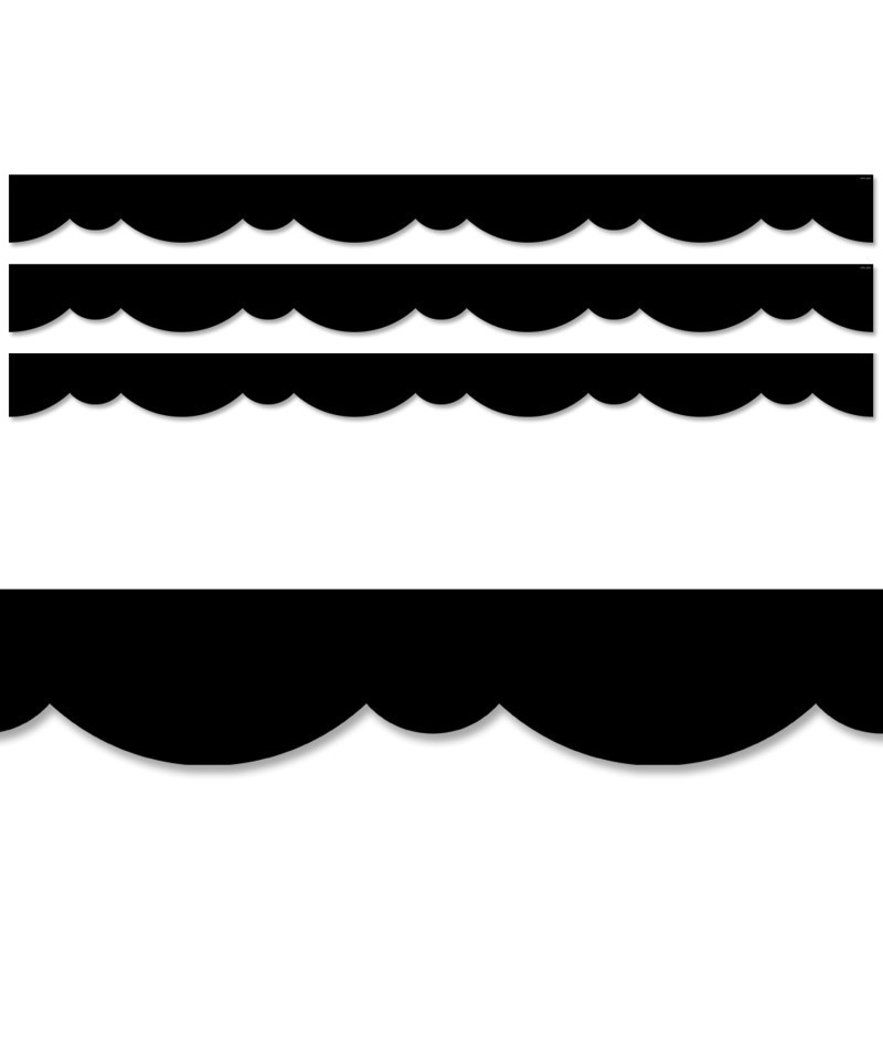 A fresh twist on a solid black border! This Black Stylish Scallops Border features a playful double scallop design to create an easy way to trim any bulletin board. Great for any type of school setting at any grade level! This bulletin board border can be used alone to create a basic look or layered with another border for a more designer look. Measures 2-3/4" wide. Each pack includes 35 feet. Sold as 3 packs for a total of 105 feet.