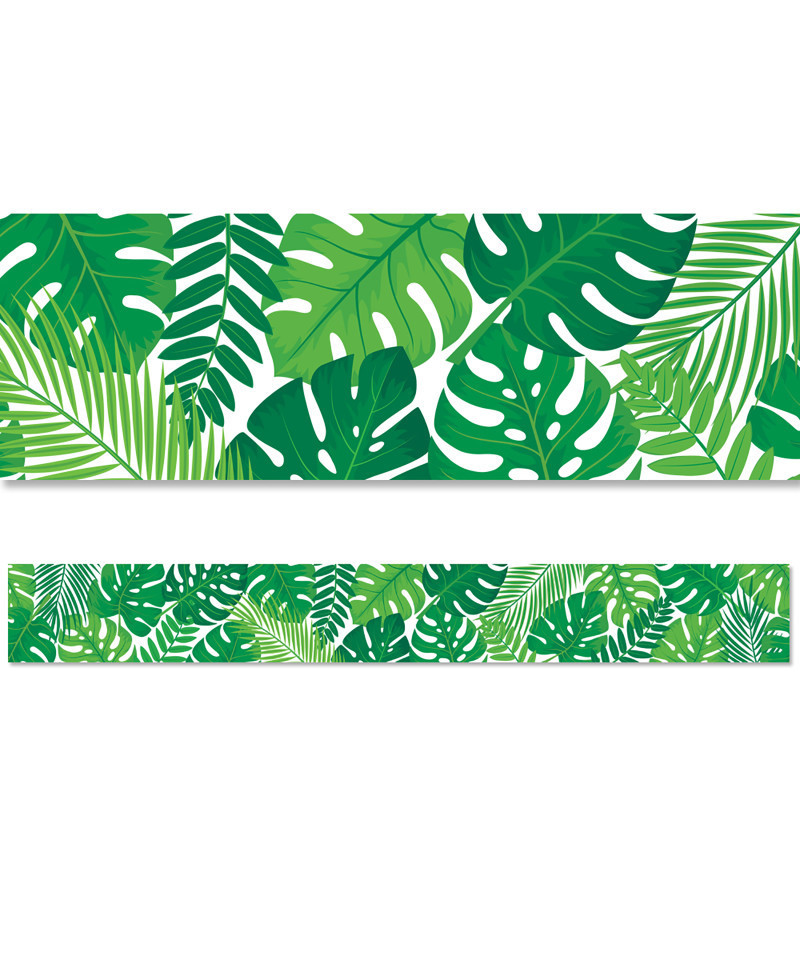 This Palm Paradise Tropical Leaves Border features a mix of lush green monstera and palm leaves. These vibrant leaves will complement a wide variety of bulletin board displays and classroom decoration themes, including those related to science, plants, nature, jungle and zoo. Use this border to trim an inspirational "Unbe-leaf-able Work" or "Be-leaf in yourself" bulletin board. These EZ borders come in smaller strips, which are easier to manage and store. Each pack comes with enough borders to complete 2 full bulletin boards. Strips measure 3" x 24". Each pack includes 24 strips (48 feet).