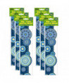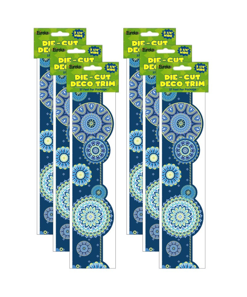 Use Eureka School Extra Wide Deco Trim to add a finishing border to your displays, windows, doorways or chalkboards. Vibrant colors plus a variety of styles and themes can add creativity to displays, windows, chalkboards and more. Full color illustration printed on card stock. Fun die-cut edge detailing. Coordinates with the Blue Harmony Collection. Blue Harmony Mandala Extra Wide Die Cut Deco Trim measures 3.25" wide, and each package contains 12 strips (each 37" long) for a total of 37 feet. Sold as 6 packs for a total of 72 strips (222 feet).