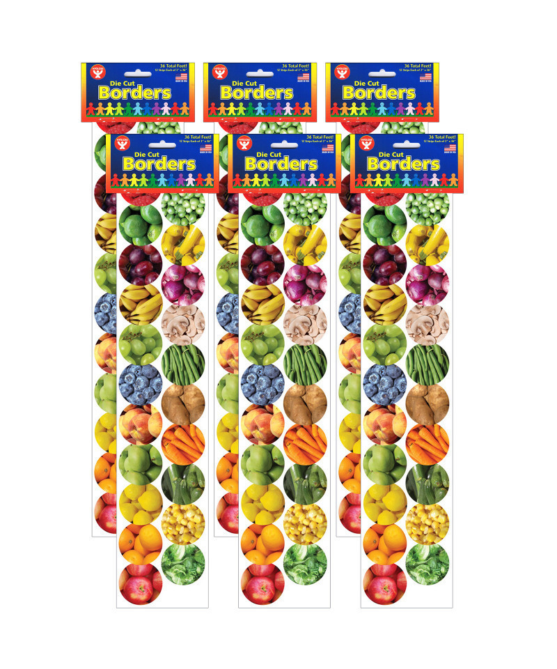 Teach healthy eating to children with the Hygloss Classroom Fruits & Veggies Border, and have your students flock to their refrigerators to eat tasty red apples, or crunchy green cucumbers as soon as they get home from school. These classroom borders have rows of yummy blueberries, grapes, bananas and other fruits, as well as rows of sliced mushrooms, fresh string beans, peas and more, to help you teach your students about the great qualities of nature's fruits and vegetables. Strips measure 3" x 36". Each pack includes 12 strips, 6 each of fruits and vegetables, for a total of 36 feet of border. Sold as 6 packs for a total of 216 feet of border.