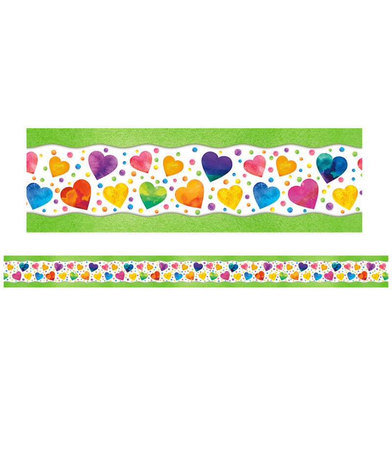 Product features colorful watercolor-look heart designs and wavy edges in lime green.