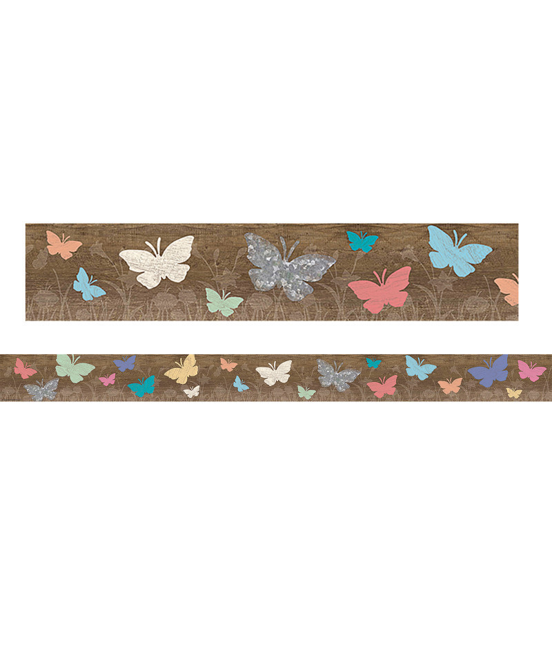 Use this butterfly-and-wood-design border trim to liven up your classroom! Create fresh looks for bulletin boards, windows, walls, and class projects. Mix and match with coordinating products (stickers, notepads, awards, etc.) for a classroom theme. Strips measure 3" x 35". Each pack includes 12 pieces.