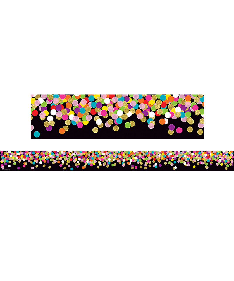 Use this Colorful Confetti on Black Straight Rolled Border Trim to liven up your classroom! Create fresh looks for bulletin boards, windows, walls, and class projects. Mix and match with coordinating products (stickers, notepads, awards, etc.) for a classroom theme. 50 foot continuous roll. (3" x 50')