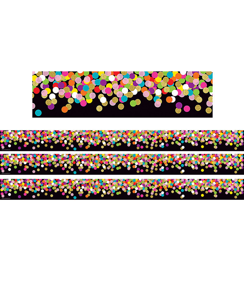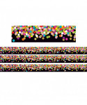 Use this Colorful Confetti on Black Straight Rolled Border Trim to liven up your classroom! Create fresh looks for bulletin boards, windows, walls, and class projects. Mix and match with coordinating products (stickers, notepads, awards, etc.) for a classroom theme. 50 foot continuous roll (3" x 50'). Sold as a pack of 3 rolls.