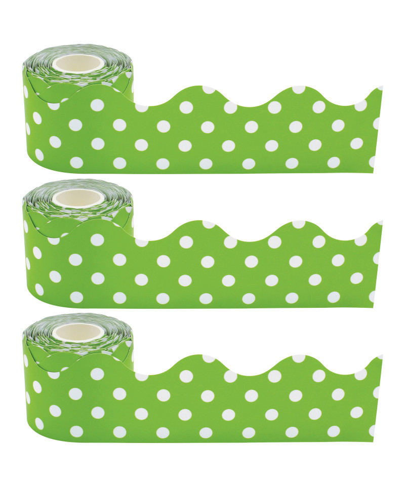 Teacher Created Resources® Lime Polka Dots Scalloped Rolled Border Trim, 50 Feet Per Roll, Pack of 3