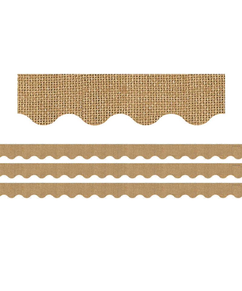 Use this Burlap Scalloped Rolled Border Trim to liven up your classroom! Create fresh looks for bulletin boards, windows, walls, and class projects. Mix and match with coordinating products (stickers, notepads, awards, etc.) for a classroom theme. 50 foot continuous roll (2-3/16" x 50'). Sold as a pack of 3 rolls.