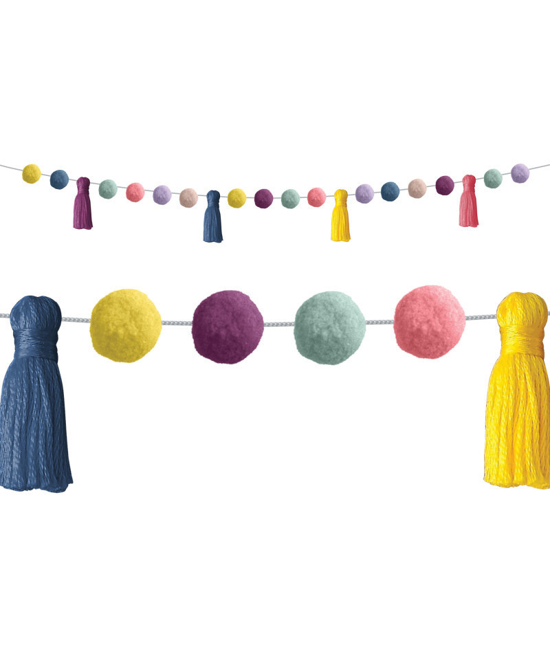 Instantly brighten any space with this pom-poms and tassels garland. This fun and festive garland will add the perfect splash of color to your home or classroom, or use it to celebrate any special occasion. Pom-poms are approximately 1-1/2" in diameter. Tassels are approximately 5" in length. Measures 60 inches in length.