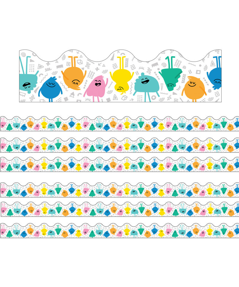Decorate your space with cheerful vibes with Carson Dellosa's Happy Place Happy Friends Scalloped Borders! The unique bulletin border features colorful, cheerful, and happy people to add a touch of positivity and inclusivity to your learning displays, wall decor, classroom borders, and more. Cut and layer your border to add dimension to any display. Each pack includes 13 durable strips of bulletin board borders made from flexible yet thick paper, each measuring 3 feet by 2-1/4 inches for a total length of 39 feet—perfect for bulletin board decor, lockers, door displays, and more! Sold as 6 packs for a total of 78 strips (234 feet).