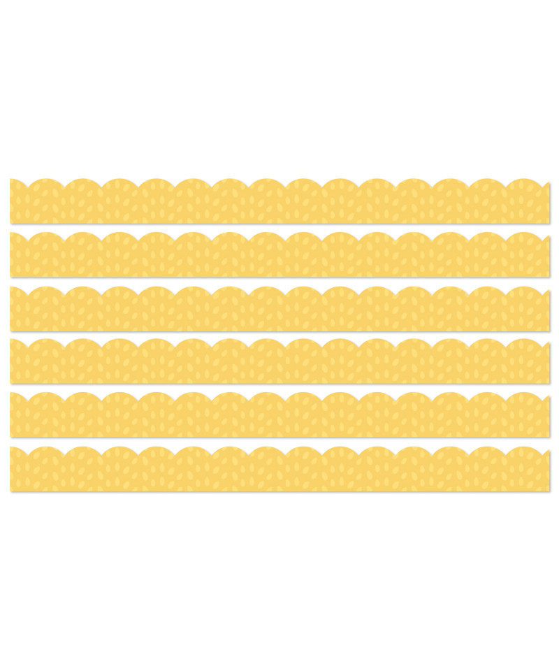 Bring thoughts of warmth and whimsy into your classroom with the calming shades of the Carson Dellosa Grow Together Yellow Bulletin Board Borders! Each pack includes 13 strips of scalloped bulletin board borders with a yellow painted polka dot design. Each bulletin board border strip measures 3 feet x 3 inches for a total of 39 feet—perfect for white board, cork board, and other colorful décor needs. Cut and layer the bulletin board border to add dimension to any display with ease. Add yellow bulletin board borders to locker and desk décor, and other classroom décor or office décor, or incorporate into spring and summer bulletin board decorations for stylish seasonal displays. Sold as 6 packs for a total of 78 strips (234 feet).