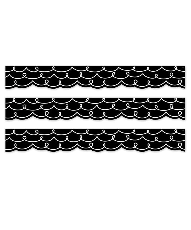 So simple but so stylish, this die-cut Loop-de-Loop on Black EZ Border features white looping lines on a black background. For a basic look, use this border alone to trim a bulletin board. To create a more sophisticated look, layer it with another colored or patterned border to give any bulletin board a unique look. Perfect for use on bulletin boards in a wide variety of classroom, office, and school settings. These EZ borders come in smaller strips, which are easier to manage and store. Each package comes with enough borders to complete 2 full bulletin board. Strips measure 3" x 24". Each pack includes 24 strips for a total of 48 feet. Sold as 3 packs for a total of 72 strips (144 feet).