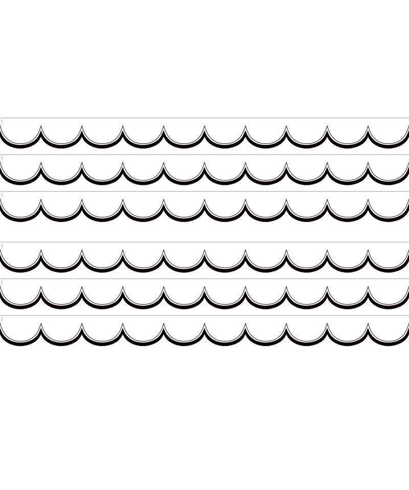 Use White and Black Scalloped Die-Cut Scalloped border trim to liven up your classroom! Create fresh looks for bulletin boards, windows, walls, and class projects. Mix and match with coordinating products (stickers, notepads, awards, etc.) for a classroom theme. Each pack has 12 pieces (2-3/16" x 35") for a total length of 35 feet of trim! Sold as 6 packs for a total of 72 pieces (210 feet).