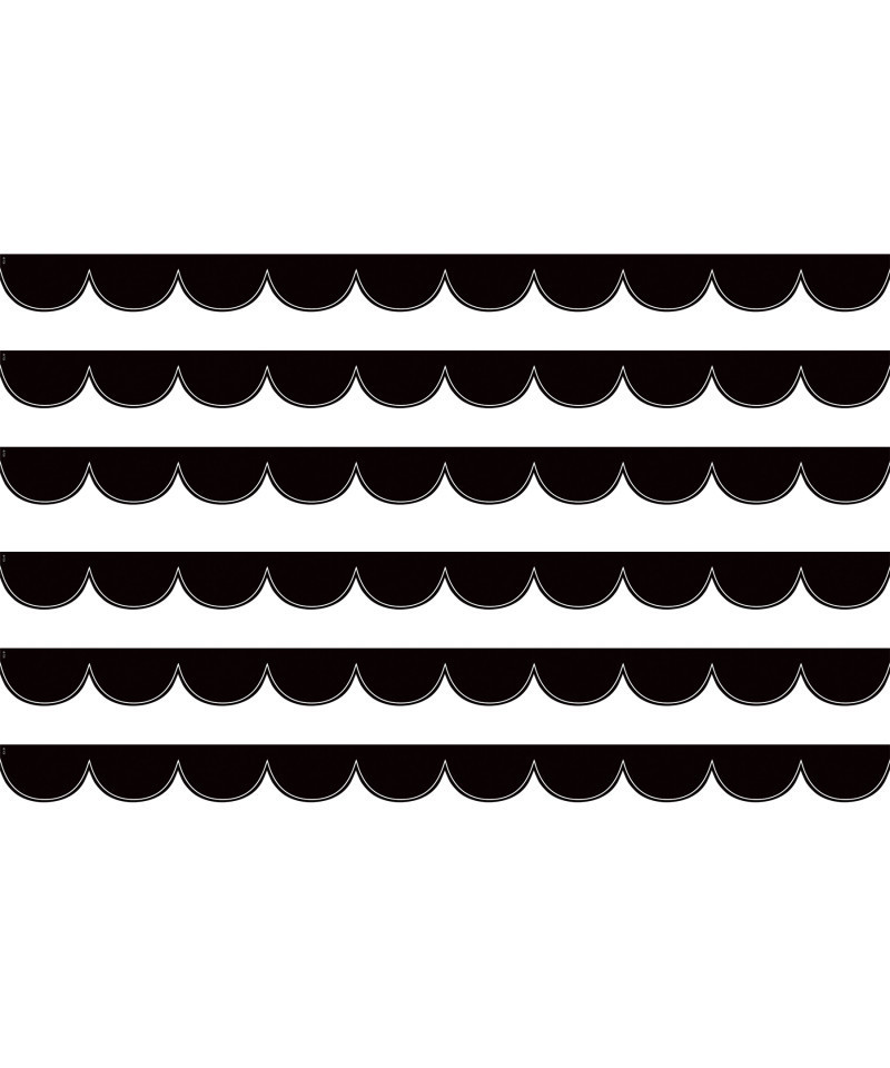 Use White and Black Scalloped Die-Cut Scalloped border trim to liven up your classroom! Create fresh looks for bulletin boards, windows, walls, and class projects. Mix and match with coordinating products (stickers, notepads, awards, etc.) for a classroom theme. Each pack has 12 pieces (2-3/16" x 35") for a total length of 35 feet of trim! Sold as 6 packs for a total of 72 pieces (210 feet).