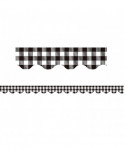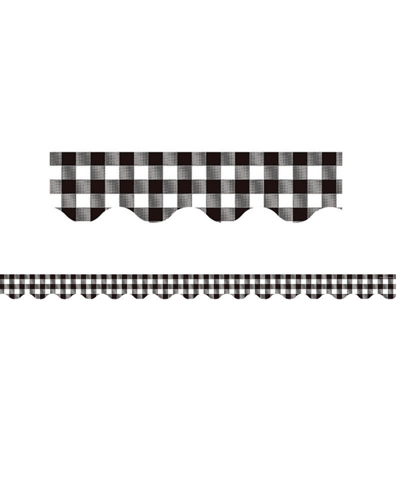 Use Black and White Gingham Scalloped border trim to liven up your classroom! Create fresh looks for bulletin boards, windows, walls, and class projects. Mix and match with coordinating products (stickers, notepads, awards, etc.) for a classroom theme. Each pack has 12 pieces (2-3/16" x 35") for a total length of 35 feet of trim!
