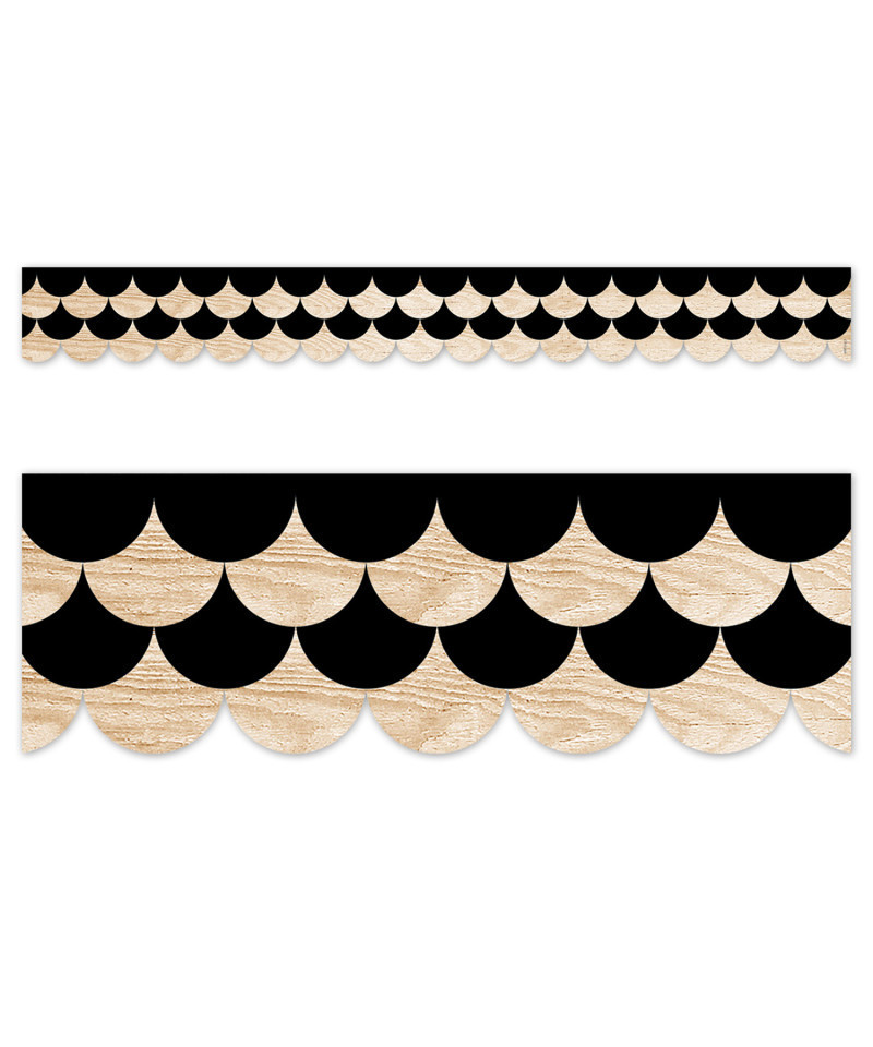 STYLISH DESIGN – This border features alternating rows of black and wood-patterned scallops that will add a touch of style to any bulletin board display.