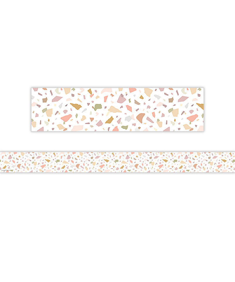 Use this terrazzo tones border trim to liven up your classroom! Create fresh looks for bulletin boards, windows, walls, and class projects. Mix and match with coordinating products (stickers, notepads, awards, etc.) for a classroom theme. Each pack has 12 pieces (3" x 35") for a total length of 35 feet of trim!