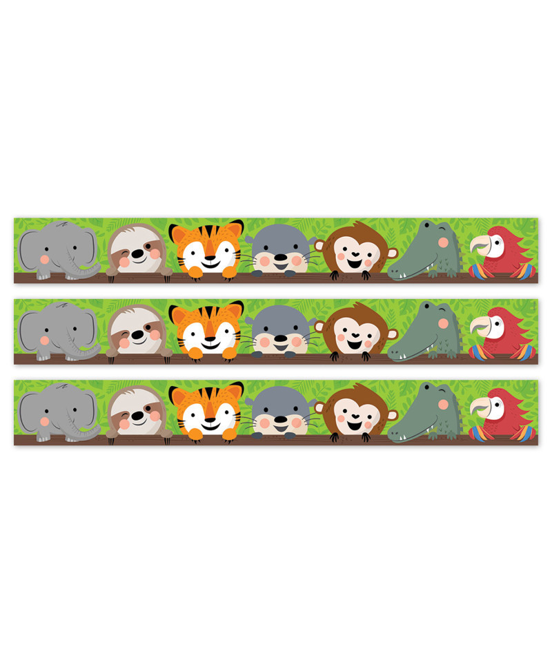 - STYLISH DESIGN – This border features 7 jungle favorites—elephant, sloth, tiger, otter, monkey, crocodile, and parrot—with a lush green backdrop that will add a touch of style to any bulletin board display.