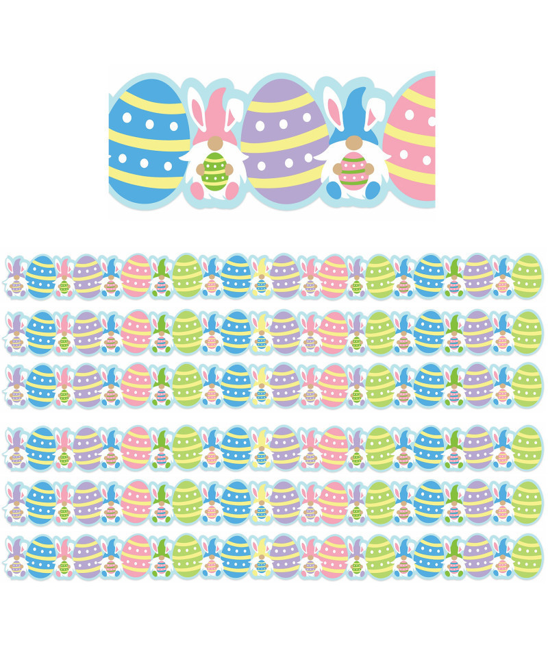 Use Eureka School Extra Wide Deco Trim® to add a finishing border to your displays, windows, doorways or chalkboards. Vibrant colors plus a variety of styles and themes can add creativity to displays, windows, chalkboards and more. Extra Wide Deco Trim® is printed on heavy weight cardstock and is reusable. Basic designs work for seasons and holidays and can be used in a variety of settings! Easter themed. Each pack includes 12 strips (each measuring 3-1/4" x 37") for a total of 37 feet. Sold as 6 packs for a total of 72 strips (324 feet).