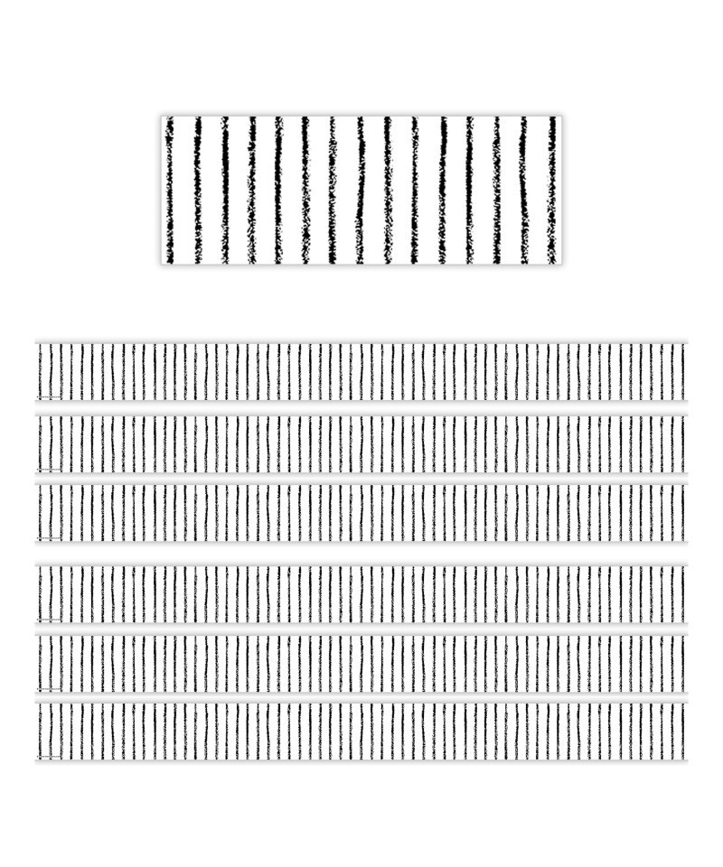 Use this white with black pinstripes border trim to liven up your classroom! Create fresh looks for bulletin boards, windows, walls, and class projects. Mix and match with coordinating products (stickers, notepads, awards, etc.) for a classroom theme. Each pack has 12 pieces (3" x 35") for a total length of 35 feet of trim! Sold as 6 packs for a total of 72 strips (210 feet).