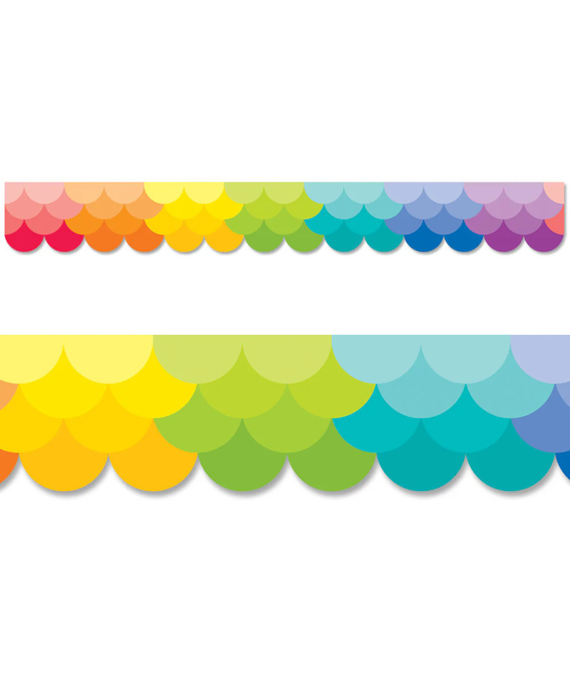 This colorful Ombre Rainbow Scallops Border will trim any bulletin board display in style! The bright and colorful ombre rainbow stands out on this versatile bulletin board border that can be used not only in a classroom or at a school but also at an office, a college dorm, or an employee break room. Layer multiple borders to create a special pop in your classroom. These new EZ borders come in smaller strips, which are easier to manage and store. Each package comes with enough borders to complete 2 full bulletin boards. Each pack includes 24 strips measuring 3" x 24" for a total of 48 feet.